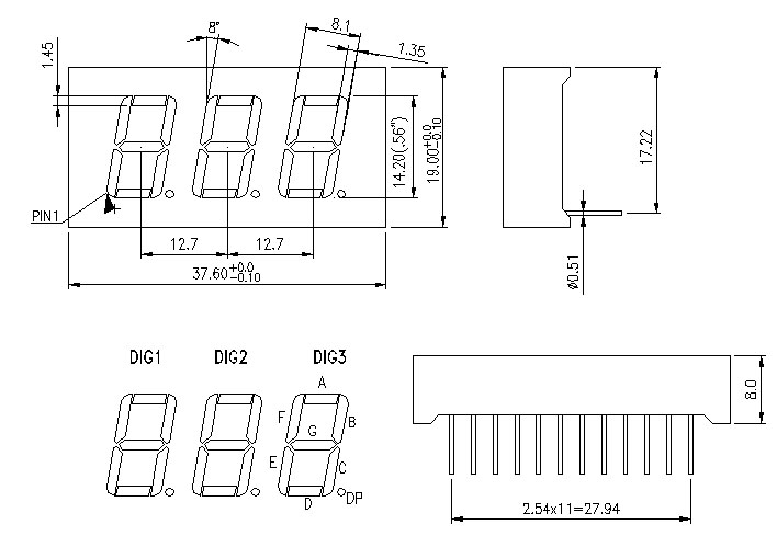 14mm(0.56”) red triple digit common anode 7 segment display
